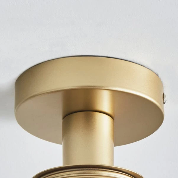 Introducing the modern, clean and bright design of the Amelie Opal Gold Glass Flush Ceiling Fitting featuring a contemporary white disc shaped glass shade sitting semi flush to the ceiling, ideal for hallways. The minimalist style of the Amelie Opal light is sure to coordinate with your current décor as it is available in a choice of satin-nickel or gold plated finishes.