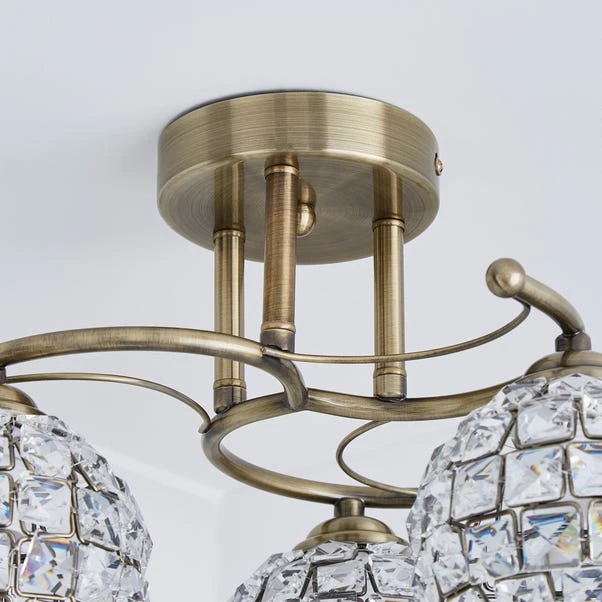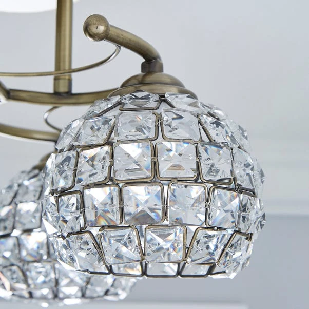 Beautifully crafted with an antique brass finish, this stunning light fitting features delicately curled arms and three round shades designed with square K9 crystals.
