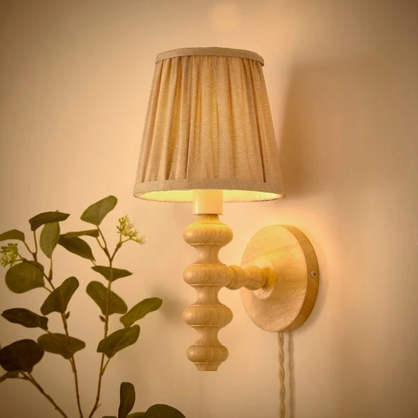 Enhance your interior with the Bobby Pleated Plug In Wall Light. Crafted with a stunning natural turned FSC rubberwood stem and matching arm, complemented by a smart gathered linen effect lamp shade, it exudes charm. Suitable for painting, so you can choose your own colour to suit your home and get the kids involved!