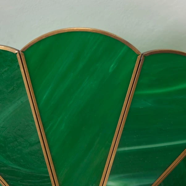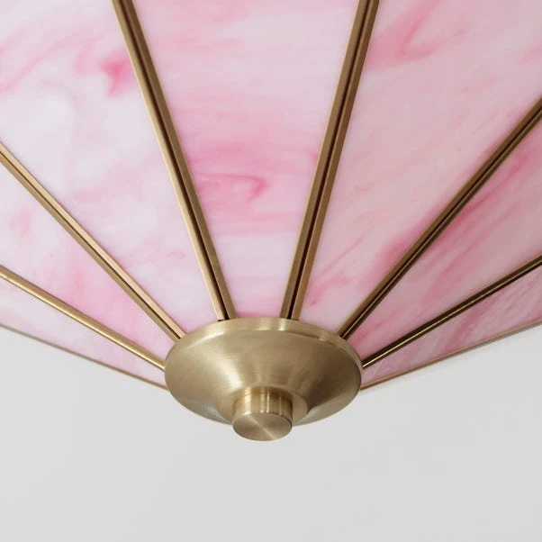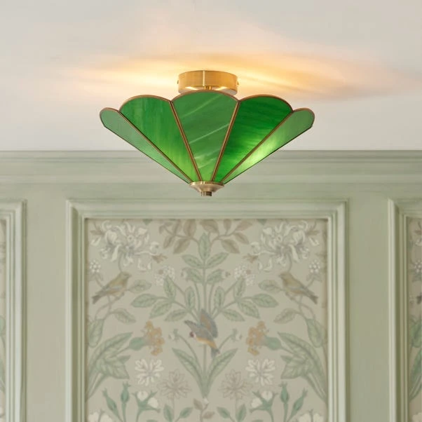 Both elegant and beautiful in design, the Colette Mid Century 2 Light Flush Ceiling Light is guaranteed to make a statement in your living space. It features a tiffany-style scalloped shade, with brass-framed marbled panel glass.