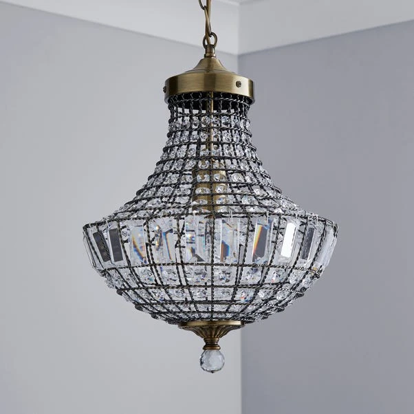 Featuring a metal chain design in an antique brass finish, this hanging ceiling fitting is decorated with intricately cut crystal glass embellishments. This light only requires 1 bulb. This piece is dimmable compatible, making it both an attractive and practical product.