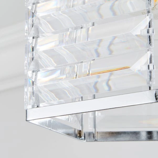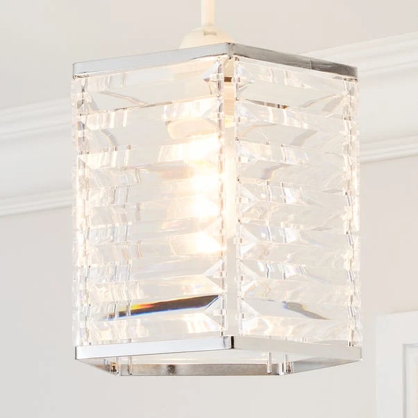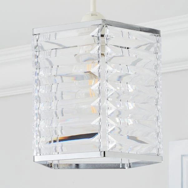 This acrylic pendant features a 5 side prism detail with clear, acrylic prisms with a metal edge finish. The pendant will connect easily to your existing lamp holder and would look perfect in any chosen room of the house. Easy Fit pendants are ideal for a quick style change without needing an electrician. Simply assemble on to your existing ceiling fitting, and you’re good to go within minutes! Don’t forget to choose the correct bulb for your ceiling fitting.