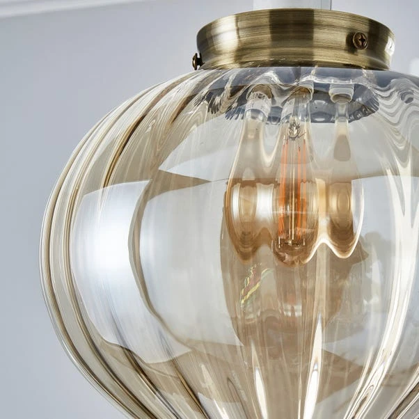 With its gorgeous timeless design, the Voyager easy fit pendant would make a stunning statement light shade in any home. Styled with satin brushed gold effect details and paired with a beautifully shaped, ribbed tinted real glass shade. This easy fit pendant is perfect for displaying statement bulbs and adding a feminine touch to any room. This piece is available in a choice of two colours to suit your space and matching family items are available to help coordinate your home. Easy Fit pendants are ideal for a quick style change without needing an electrician. Simply assemble on to your existing ceiling fitting, and you’re good to go within minutes! Don’t forget to choose the correct bulb for your ceiling fitting.